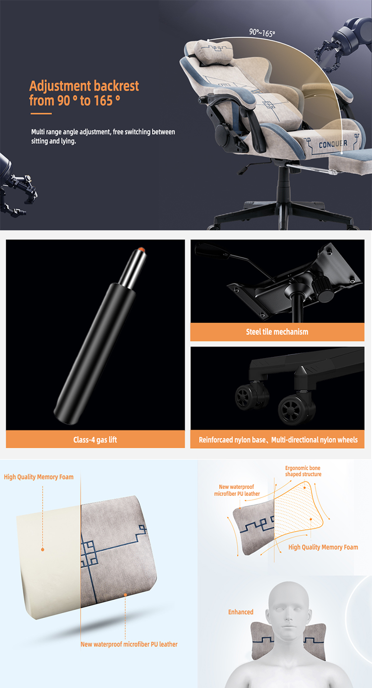 Multi Function: relaxing footrest; armrest and seat height adjustable; up 90 to 160 degree, reclining; 360 degree swivel; removable headrest pillow and lumbar cushion for added support.