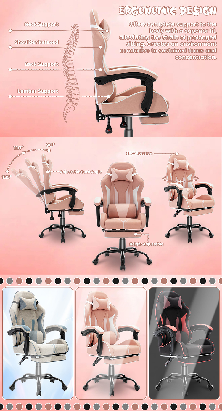 Multi Function: relaxing footrest; armrest and seat height adjustable; up 90 to 160 degree, reclining; 360 degree swivel; removable headrest pillow and lumbar cushion for added support.